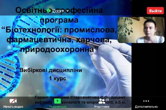 Днями гарантка освітньо-професійної програми «Біотехнології: фармацевтична, промислова, харчова, природоохоронна» першого (бакалаврського) рівня вищої освіти к.б.н., доцентка Світлана Старовойтова провела низку зустрічей зі здобувачами першого, другого та третього років навчання щодо реалізації ними права на вільний вибір навчальних дисциплін на наступний, 2022-2023 навчальний рік.