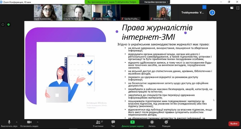 Продовжила обговорення студентка Ольга Хажанець із доповіддю про права журналістів, які працюють у Інтернет-ЗМІ. Важливі положення, що регламентуються законодавством, Ольга донесла до своїх друзів у цікавій доступній формі. Зокрема, майбутні рекламісти дізналися, чи може журналіст писати під псевдонімом, чи має він право відмовитися від авторства на матеріал, і які технічні засоби дозволяється використовувати у журналістській практиці.