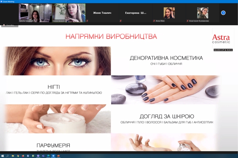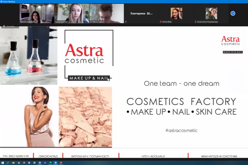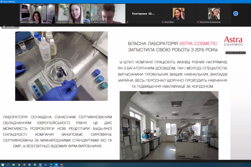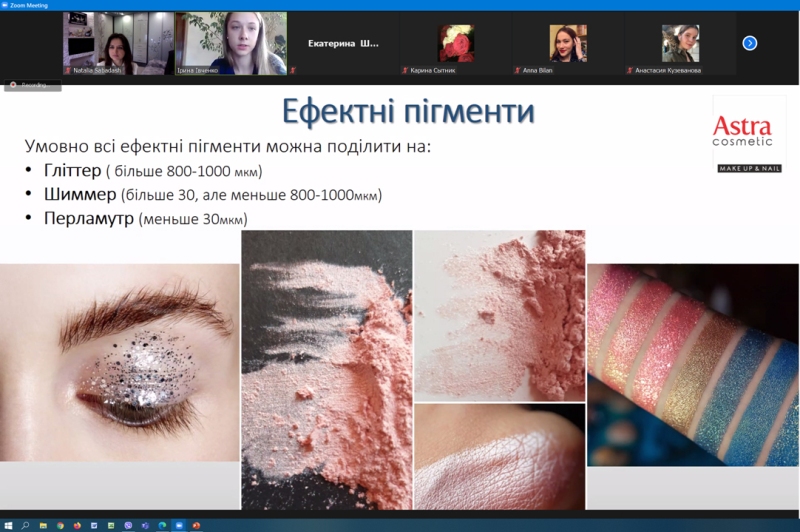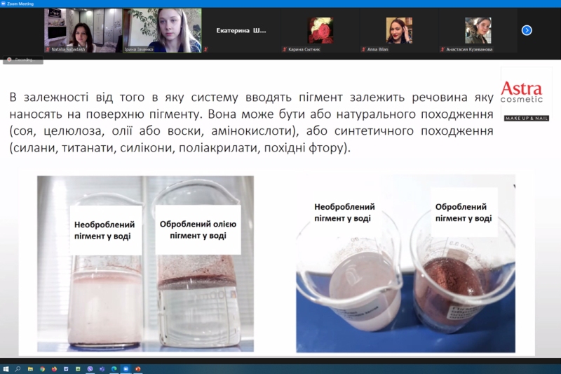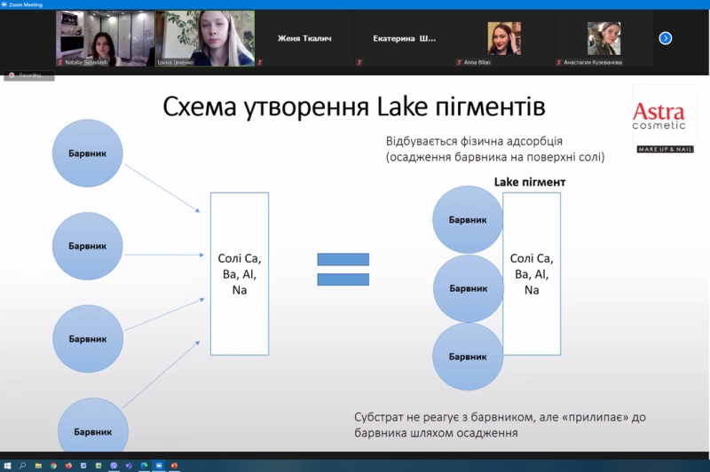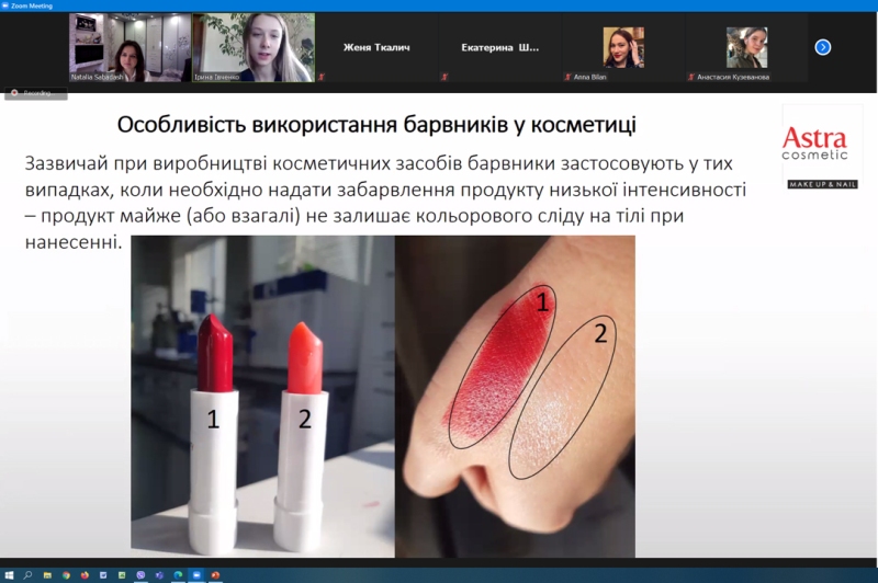 У своїй доповіді фахівчиня зробила акцент на відмінності між поняттями «барвник» і «пігмент», продемонструвала відео, які підтвердили особливості їх застосування в декоративній косметиці. Познайомила з широким розмаїттям сировини, сертифікованої за міжнародними стандартами ISO та GMP, яку компанія закуповує у всесвітньо відомих фірм-виробників. Зустріч носила й практичний характер, адже завдяки відеоматеріалу студенти мали змогу на власні очі побачити основне обладнання, що є особливо цінним в умовах карантинних обмежень.