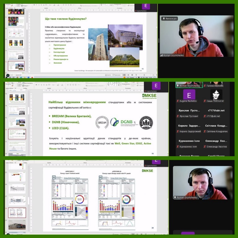 Цікавий теоретичний матеріал викладач проілюстрував передовими технологіями у галузі енергоефективності будівель, їхнього математичного моделювання, проблем проєктування таких будівель і стану впровадження енергоефективних технологій в Україні, Європі та світі загалом.