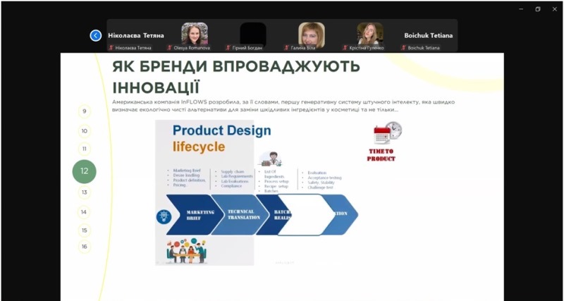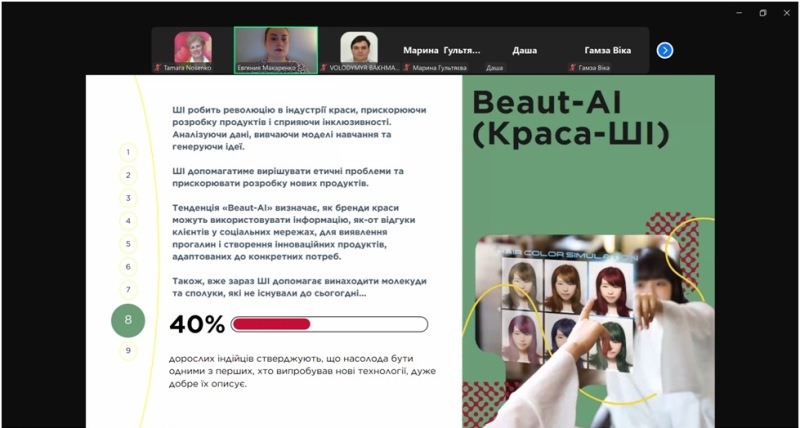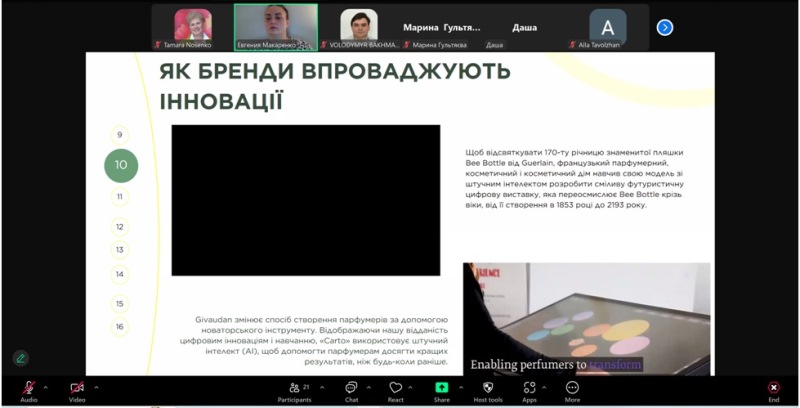 Про штучний інтелект у інноваційних технологіях виробництва продуктів для краси та персонального догляду і не тільки дізналися магістранти освітніх програм «Хімічні технології харчових добавок та косметичних засобів» і «Технології рослинних олій, жирових та косметичних продуктів» кафедри технології жирів, хімічних технологій харчових добавок та косметичних засобів на гостьовій лекції керівниці відділу маркетингу компанії «Іnveran» Євгенії Макаренко.