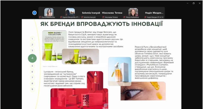 Лекція з дисципліни «Інновації у технологіях харчових добавок та косметичних засобів» була присвячена глобальним трендам у технологіях косметичної галузі та впровадженням інновацій відомими косметичними брендами.