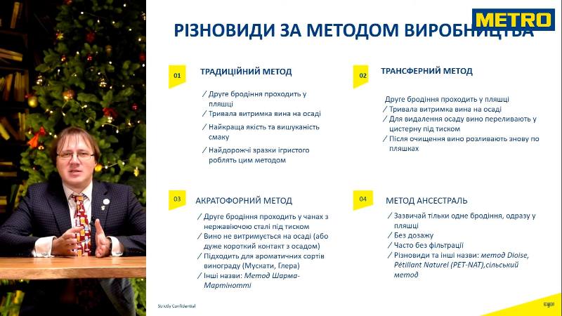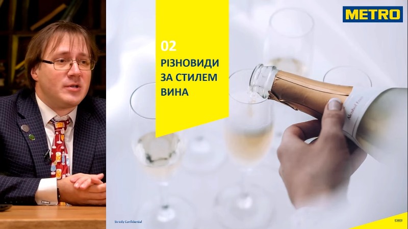 Сомельє познайомив слухачів із різновидами, стилем і методами (трансферний, акратофорний, ансестраль) виробництва ігристих вин, країнами походження, сортами винограду, які використовують у виробництві закордонних і вітчизняних ігристих вин. Коротко розповів про вибір ігристого вина за вмістом цукру, ароматом насиченості відповідно до смакових вподобань.