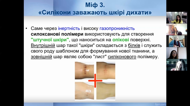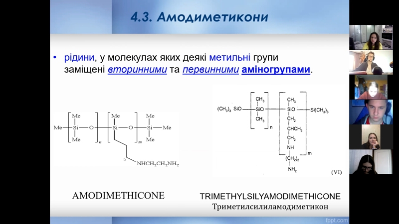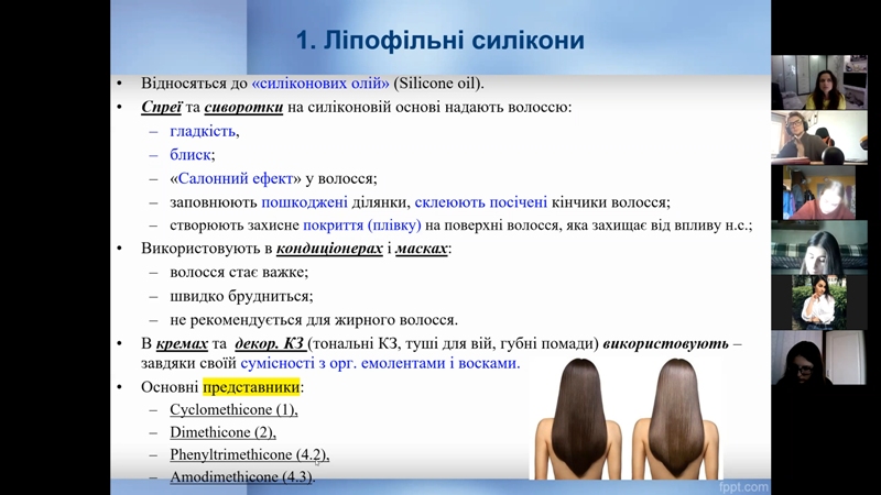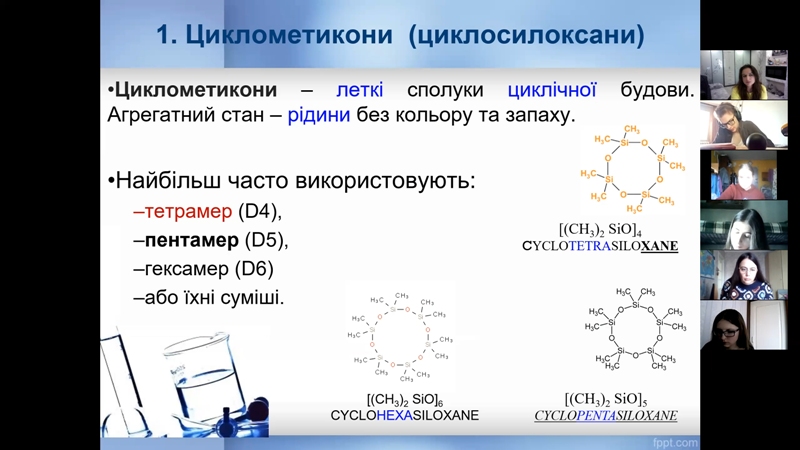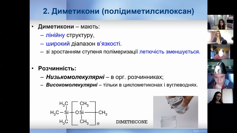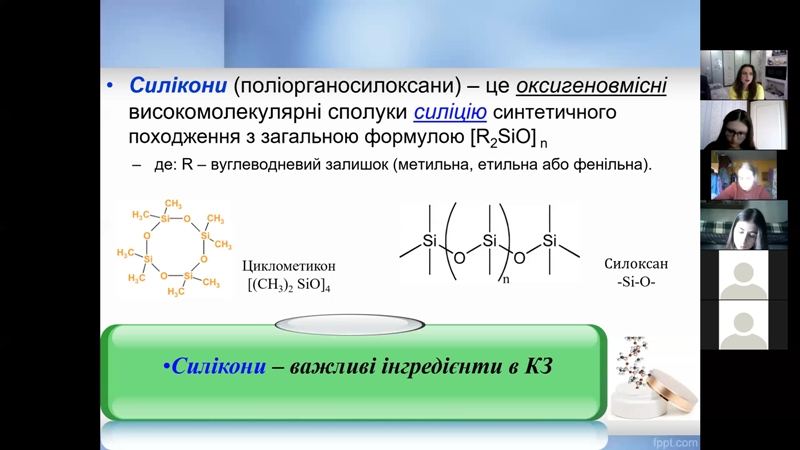 Викладачка розглянула актуальні питання парфумерно-косметичної галузі, навела класифікацію силіконів за хімічним складом, представила їх просторову будову, розставила акценти на застосуванні силіконів у різних видах косметичних засобів залежно від їх властивостей. Зробила огляд світового ринку щодо інноваційних компонентів, які виступають альтернативою силіконам і надала коротку характеристику певним представникам.