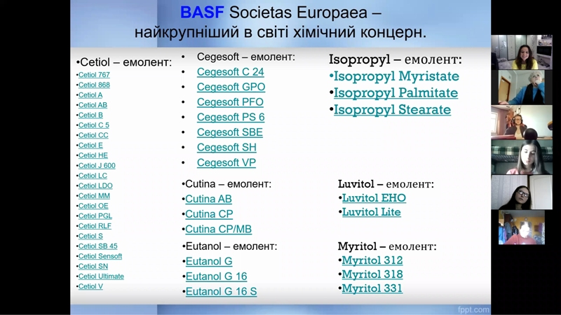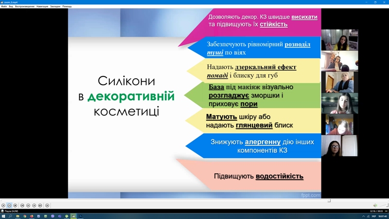 Лекторка зупинилася на безпечності застосування силіконів, впливі на організм, обґрунтувала причини заборони окремих представників цього класу інгредієнтів, а також розглянула екологічні проблеми, пов’язані з виробництвом та утилізацією. Зосередила увагу здобувачів на результатах досліджень діючого в США Центру по вивченню впливу силіконів на навколишнє середовище, здоров'я та безпеку (Silicones Environmental, Health, and Safety Center), на висновки Програми досліджень силоксанів (Siloxane Research Program), також спиралась на дані з безпеки силіконів Панелі експертів CIR (Cosmetic Ingredient Review), експертної ради при Єврокомісії SCCS (EU Scientific Committee on Consumer Safety – Науковий комітет з безпеки споживачів) і результати наукового огляду, проведеного в Канаді й Австралії.
