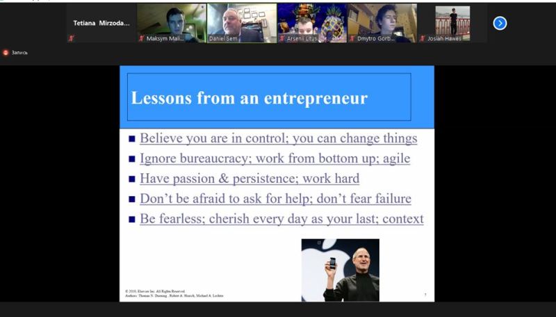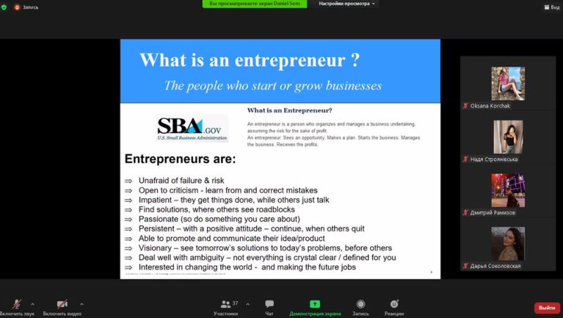 21 грудня 2020 р. здобувачі вищої освіти кафедри туристичного та готельного бізнесу дізнавалися, хто такий підприємець і чим він займається, у рамках цікавого вебінару американського професора Даніела Сема.