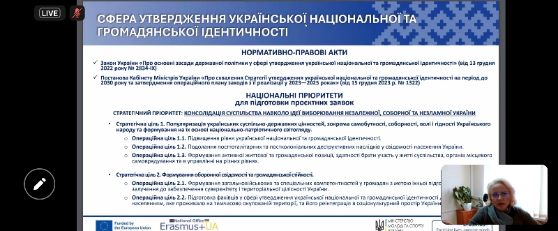 Начальниця управління міжнародного співробітництва та європейської інтеграції Міністерства молоді та спорту України Наталя Радчук наголосила на важливості проєктів Еразмус+ для розвитку цих сфер, особливо в умовах воєнного стану.