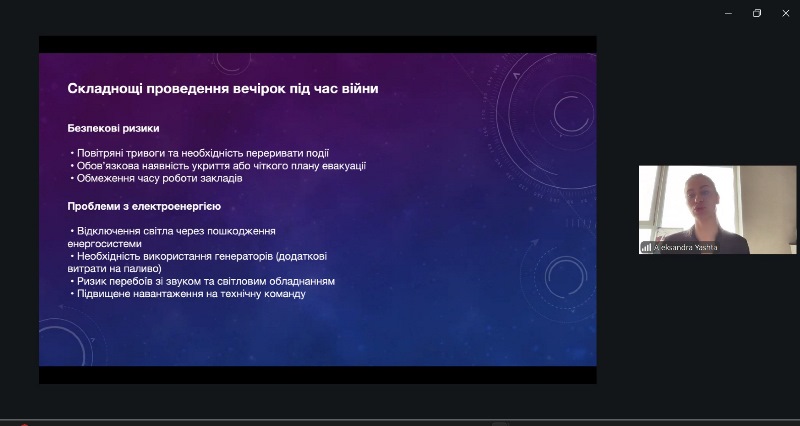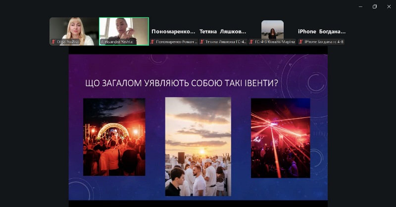 Спікеркою стала засновниця та власниця проєкту «Yashta Events», випускниця кафедри готельно-ресторанної справи Олександра Яшта, яка завітала до освітнього онлайн-простору на запрошення лекторки дисципліни Ольги Пушки.