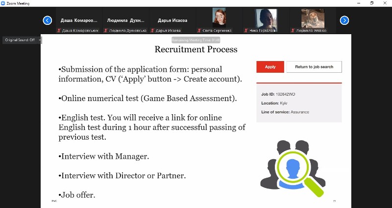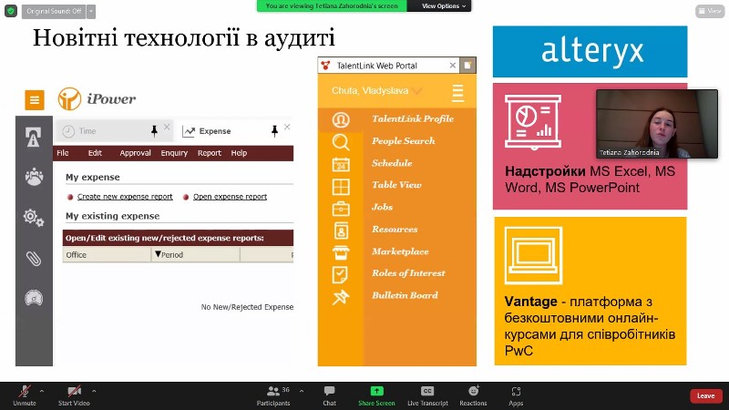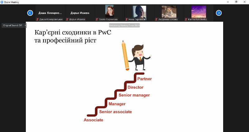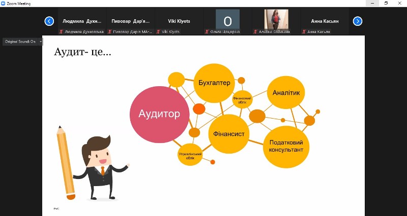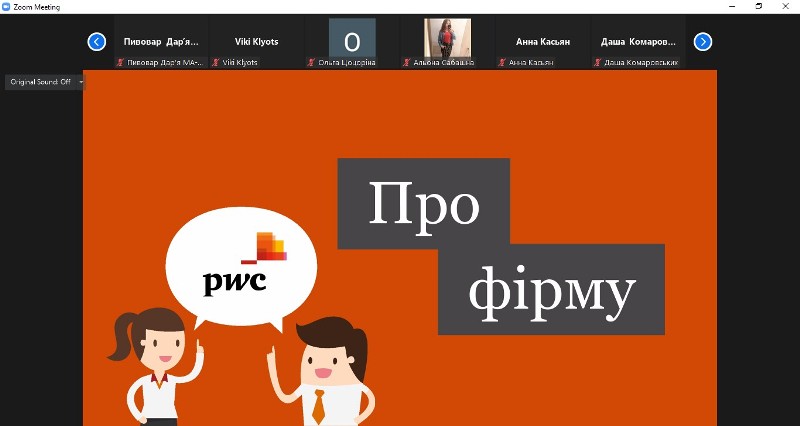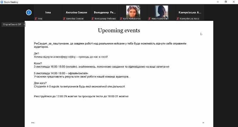 Спікерка ознайомила присутніх із діяльністю компанії та основними клієнтами, які відомі не тільки на ринку України. Виокремила знання та навики, отримані під час навчання в університеті, що використовує у роботі. Відзначила високий рівень командної роботи і комунікацій у колективі, що сприяє комфортній адаптації новачків до роботи. Також, виділила перелік програм, якими користуються в сучасному ритмі праці компанія, та запросила всіх бажаючих приєднуватися до колективу PwC. Частина зустрічі була присвячена особливостям проходження етапів відбору персоналу компанією та в який спосіб це здійснюють зважаючи на сезонність. Поділилася власним досвідом проходження співбесід і підбадьорила, вмотивувала здобувачів навчатися.