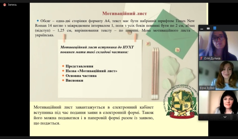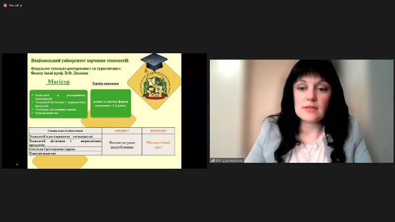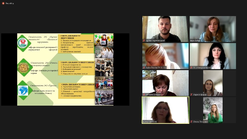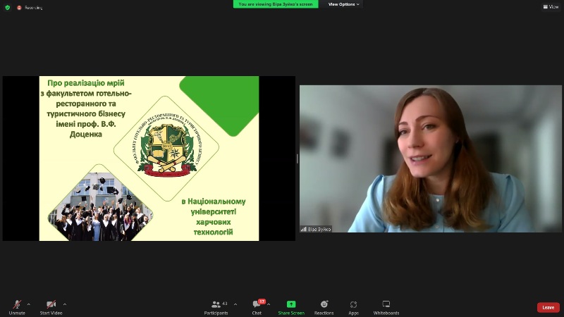 Профорієнтаційну онлайн-зустріч модерувала відповідальна за профорієнтаційну роботу факультету, доцентка кафедри технології ресторанної і аюрведичної продукції Віра Зуйко.