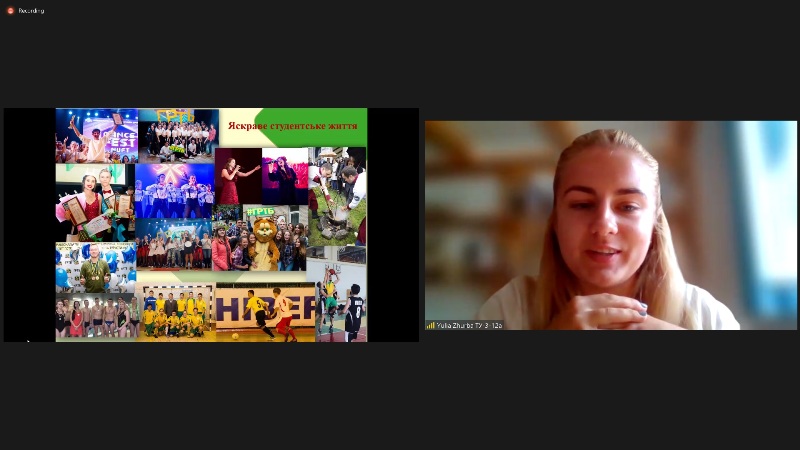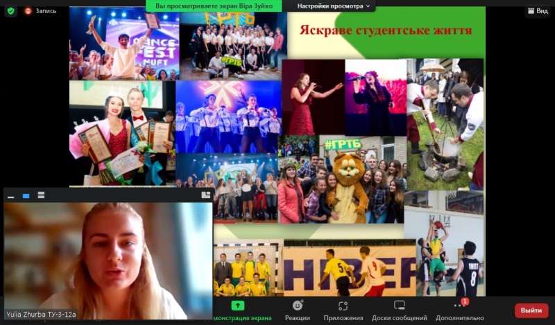 Найкраща презентація факультету від улюблених і талановитих студентів, на відеозв’язку цього дня – здобувачка бакалаврського рівня освіти англомовної групи, відмінниця навчання, староста, активістка Юлія Журба. Про яскраве, масштабне і різноманітне студентське життя в офлані та онлайні розповідь доповнила заступниця декана по роботі зі студентами Олена Тищенко.