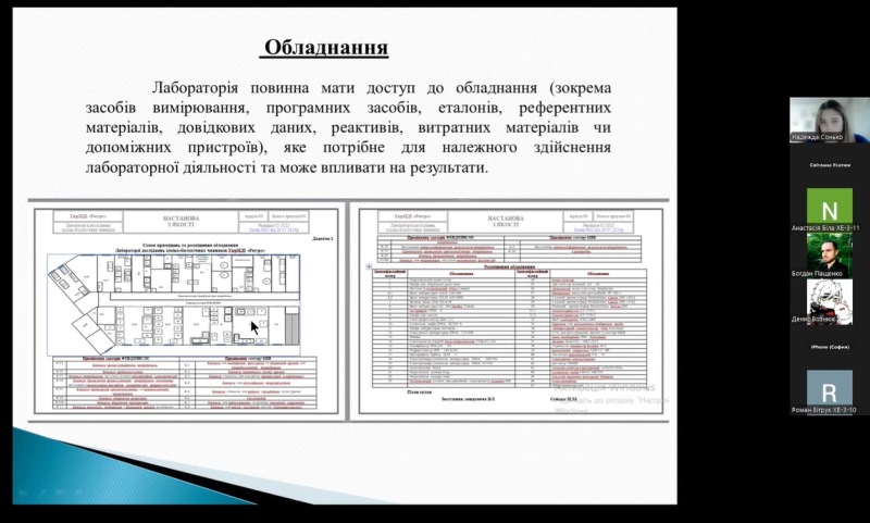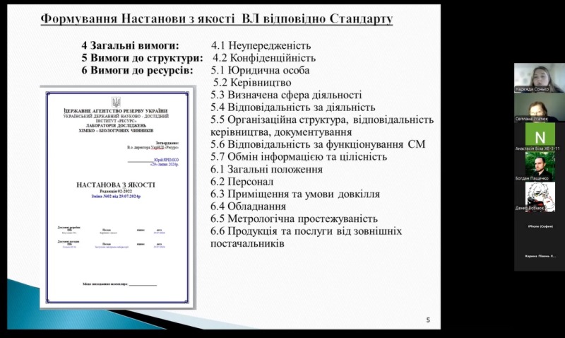 Спікерка наголосила, що система менеджменту у лабораторії досліджень хіміко-біологічних чинників відповідає вимогам стандарту та включає: документи системи менеджменту, управління документами системи менеджменту, управління результатами, дії стосовно ризиків і можливостей, поліпшування, коригувальні дії, внутрішні аудити, аналізування з боку керівництва.