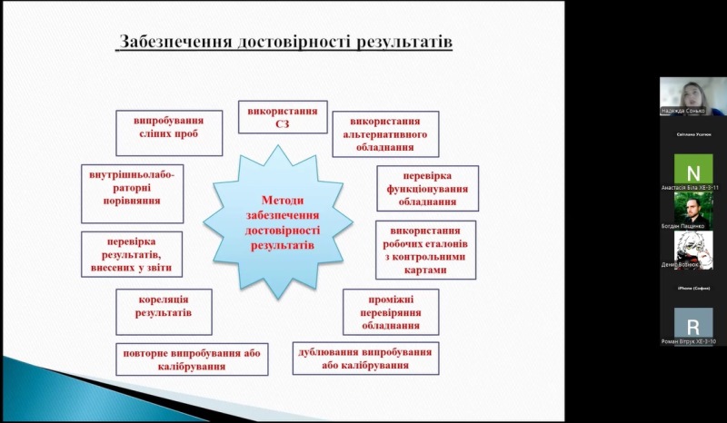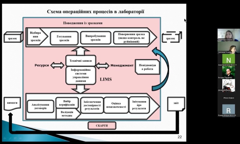 На запрошення гарантки освітньої програми «Технологічна експертиза та безпека харчової продукції», лекторки навчальної дисципліни «Організація роботи виробничих і випробувальних лабораторій», доцентки кафедри експертизи харчових продуктів Світлани Усатюк заступниця завідувачки лабораторії досліджень хіміко-біологічних чинників Українського державного науково-дослідного інституту «Ресурс» Надія Сонько прочитала лекцію «Система управління якістю випробувань харчових продуктів у акредитованій лабораторії» для здобувачів-третьокурсників першого (бакалаврського) рівня вищої освіти спеціальності 181 «Харчові технології».