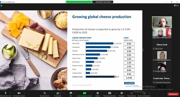 Гостьова онлайн-лекція була прочитана за профілем вибіркових навчальних дисциплін «Харчові добавки: гармонізація регламентів ЄС у виробництві молочних і молоковмісних продуктів», «Технологія сирів» та «Технології незбираномолочних продуктів та морозива» освітньо-професійних програм «Технології зберігання, консервування та переробки молока» та «Харчові технології та інженерія».