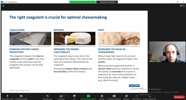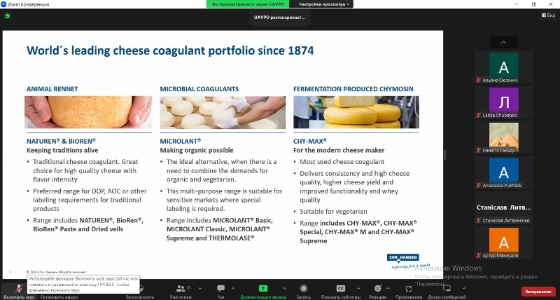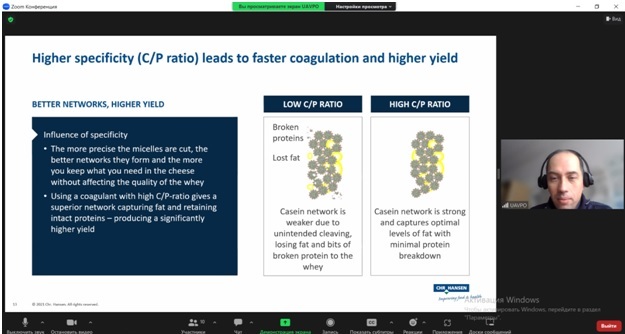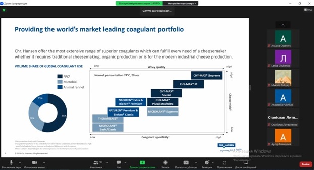 Основна частина лекції була присвячена детальному вивченню портфоліо сучасних коагулянтів фірми «Хр. Хансен». Воно не обмежується сичужними ферментами тваринного походження (Naturen, BioRen), а суттєво підсилено мікробіальними (Microlant, ThermoLase) та ферментативними коагулянтами (CHY-MAX) нової генерації. Спікером доступно та водночас глибоко обґрунтовано ефективність і переваги використання хімозину третього покоління CHY-MAX® Supreme – гордості компанії. Володимир Поліщук зупинився на характеристиці C/P – ratio (С- коагуляція, Р – протеоліз), яка допомагає технологам підібрати ефективний коагулянт для формування належних характеристик готової продукції.