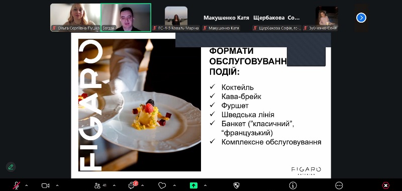 На кафедрі готельно-ресторанної справи відбувся лекторій-нетворкінг із фахівцем у сфері кейтерингу, успішним випускником факультету готельно-ресторанного та туристичного бізнесу імені проф. В.Ф. Доценка, сервіс-менеджером компанії Figaro Family Group Богданом Яценком.