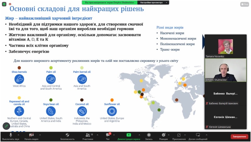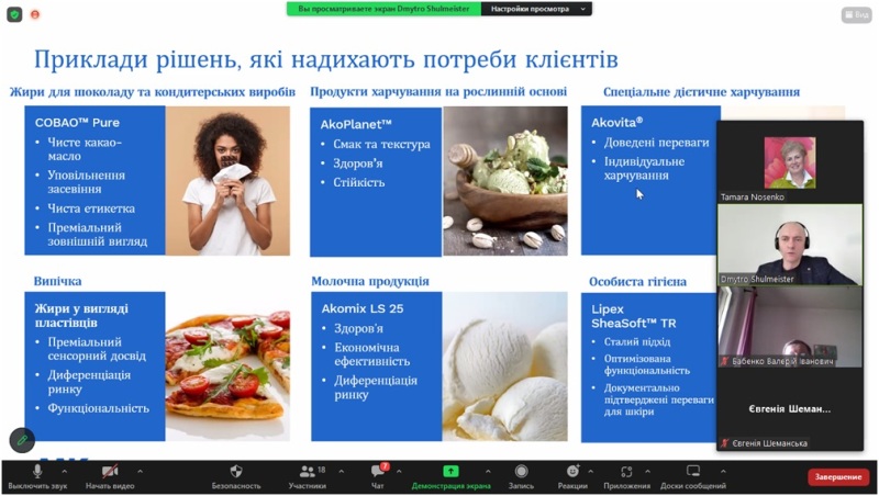 У роботі секції взяли участь також представники компаній, які працюють в олійно-жировій галузі, зокрема основні напрями роботи міжнародної компанії зі шведським корінням «ААК» презентував директор представництва в Україні Дмитро Шульмейстер. «ААК» має 150-річний досвід роботи в олійно-жировій галузі і спеціалізується на розробленні технологій, виробництві та наданні на ринку спеціальних жирів, у тому числі для кондитерських виробів, хлібопекарських жирів, замінників молочного жиру тощо. Компанія розробляє інноваційні продукти, які мають чітко визначені властивості та призначення, як то еквіваленти какао-масла, жири, що надають продуктам необхідних смакових якостей, наприклад, веганські стейки зі смаком м'яса тощо. Доповідь про компанію викликала велику зацікавленість у присутніх.
