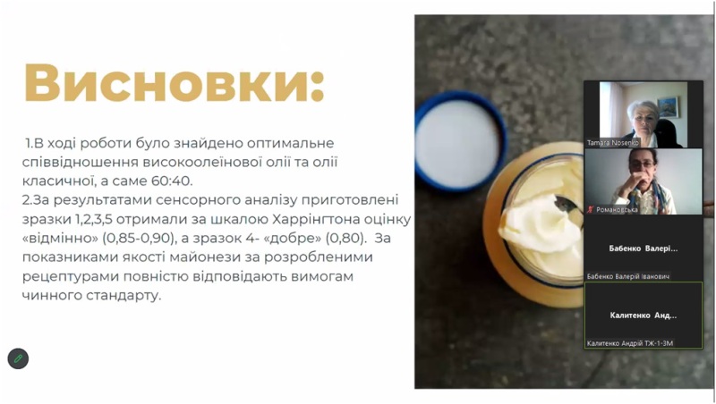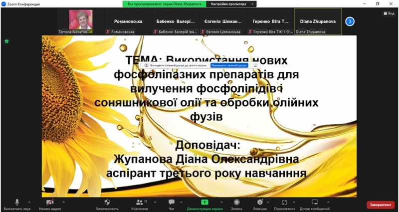 У рамках роботи 89-тої Міжнародної наукової конференції молодих учених, аспірантів і студентів «Наукові здобутки молоді – вирішенню проблем харчування людства у ХХІ столітті» 4 квітня відбулося засідання секції «Технології жирів та парфумерно-косметичних продуктів», на якому були заслухані результати наукових робіт магістрантів та аспірантів кафедри технології жирів, хімічних технологій харчових добавок та косметичних засобів Андрія Калитенка, Віти Гіренко, Діани Жупанової та інших.