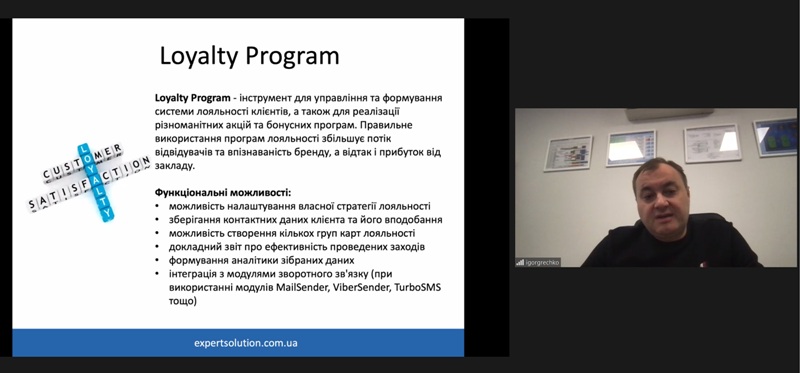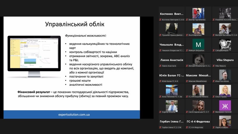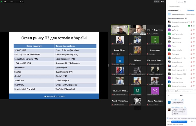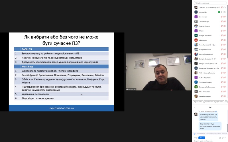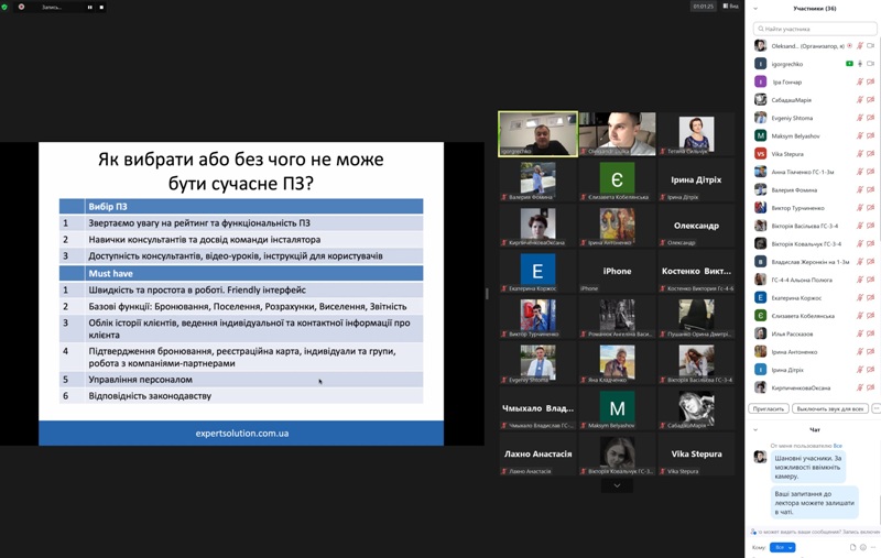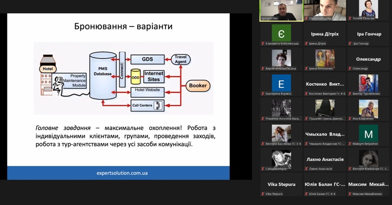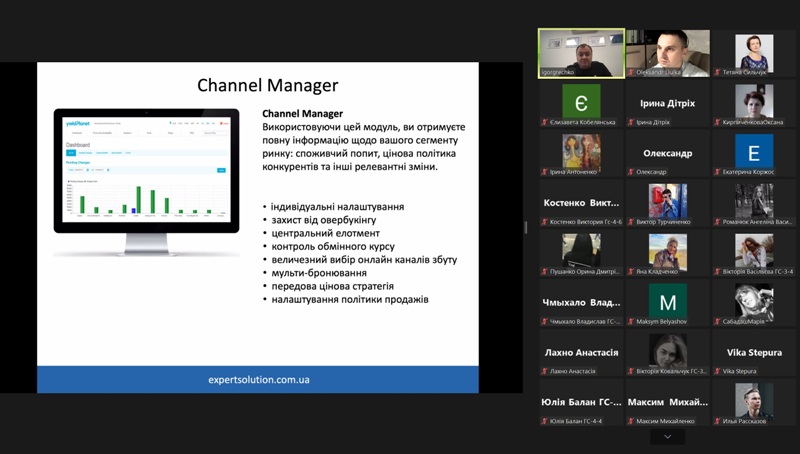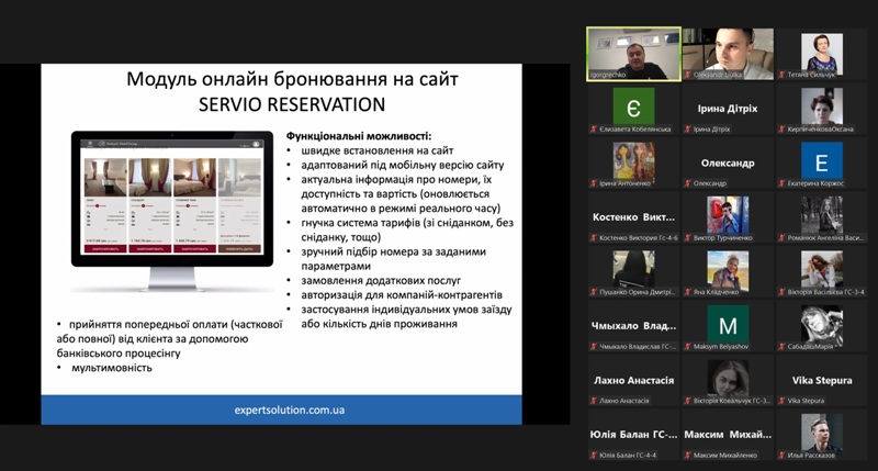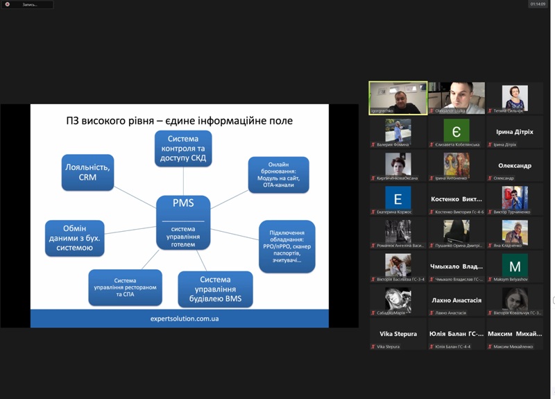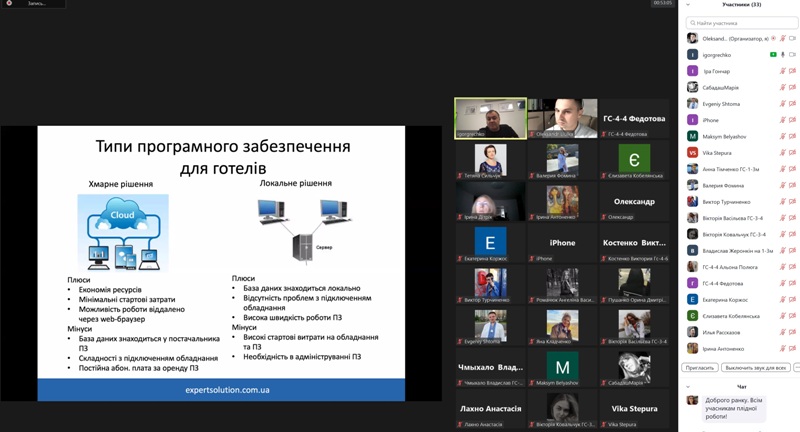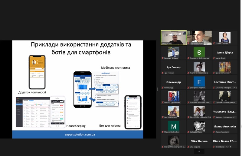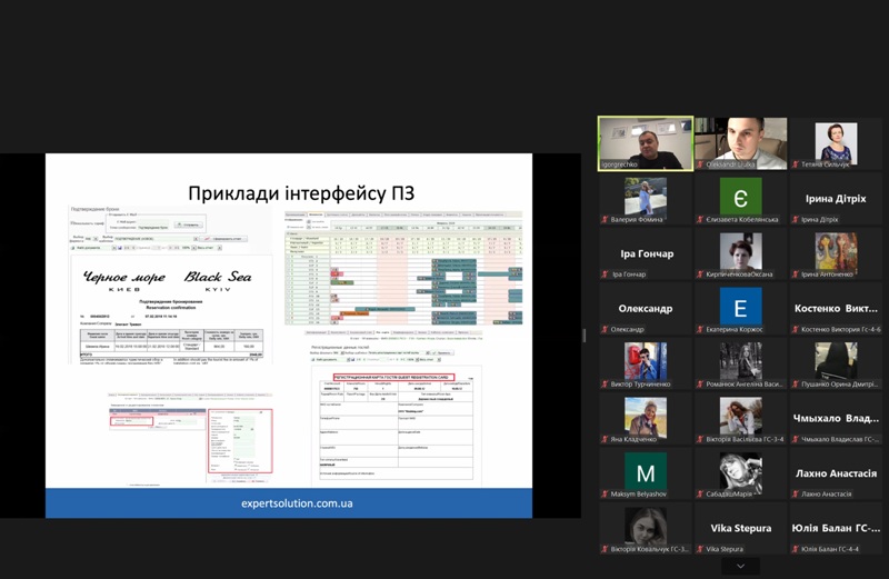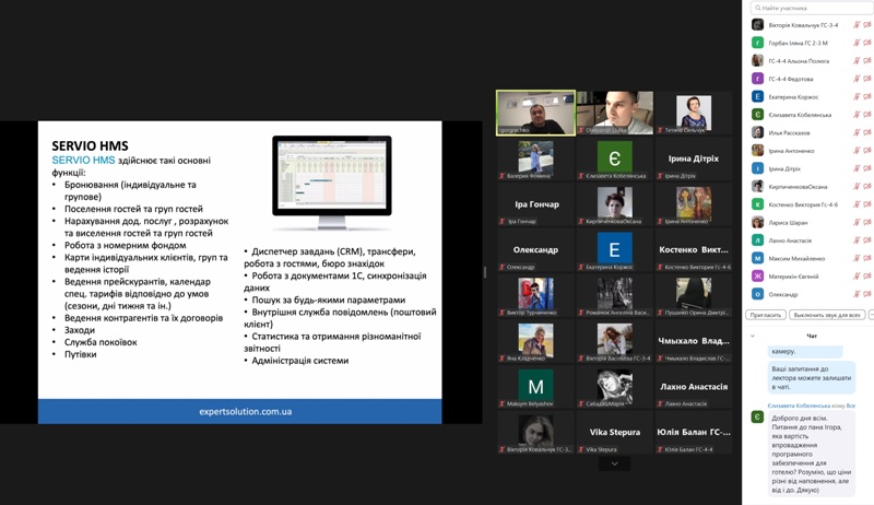 24 жовтня 2022 року в рамках дисципліни «Моделювання діяльності закладів готельно-ресторанного господарства» для здобувачів освіти спеціальності 241 «Готельно-ресторанна справа» відбувся гостьовий лекторій «Програмне забезпечення для управління сферою гостинності» від головного виконавчого директора компанії «Expert Solution» Ігоря Гречка.