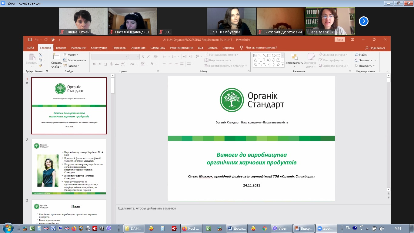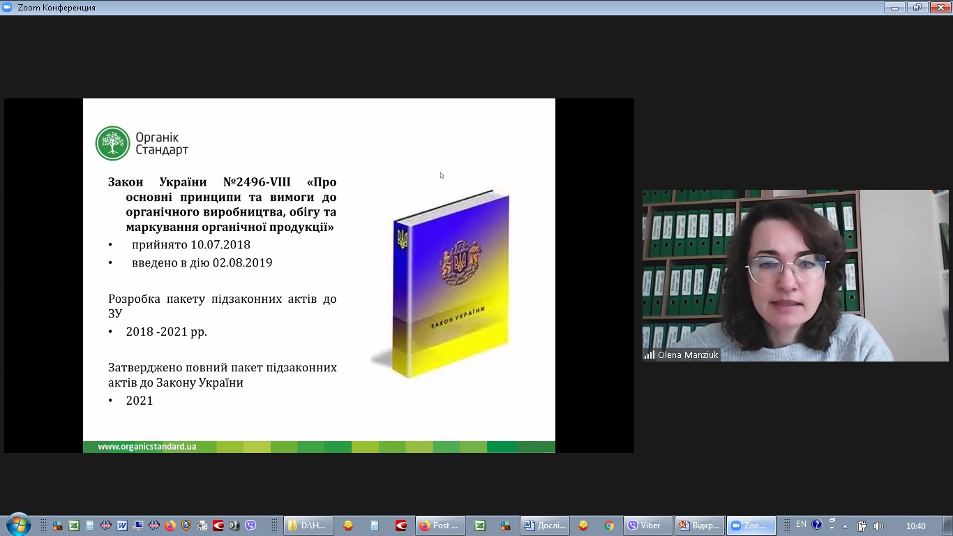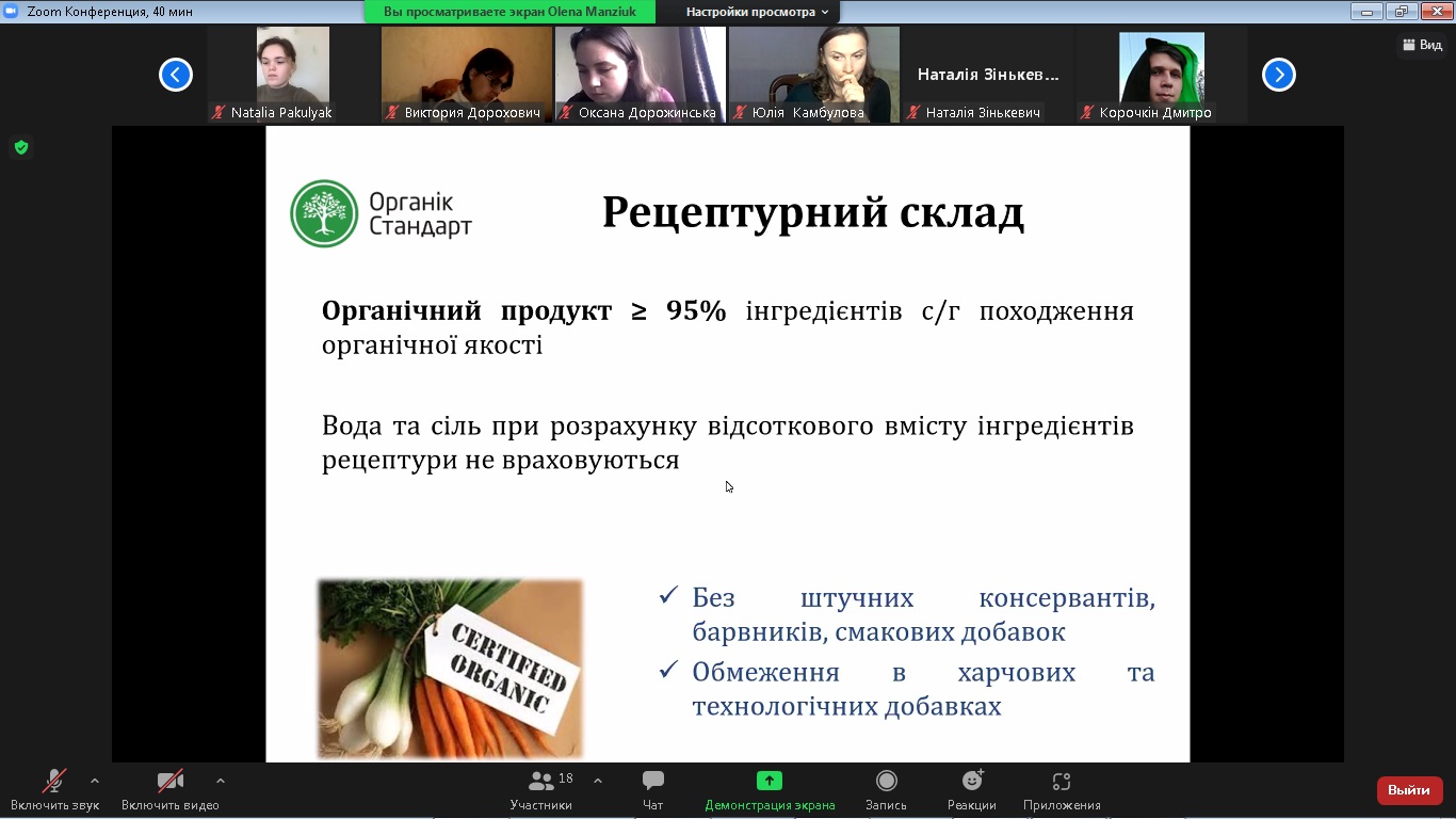 На кафедрі технології хлібопекарських і кондитерських виробів відбулася гостьова онлайн-лекція для здобувачів освітнього ступеня «Магістр», що навчаються за освітньою програмою «Технології органічних харчових продуктів», з дисципліни «Нормативно-правова база виробництва органічних харчових продуктів», яку прочитала провідна фахівчиня зі сертифікації та якості Сертифікаційного органу ТОВ «Органік Стандарт» Олена Манзюк. Тема лекції – «Вимоги до органічних харчових продуктів».