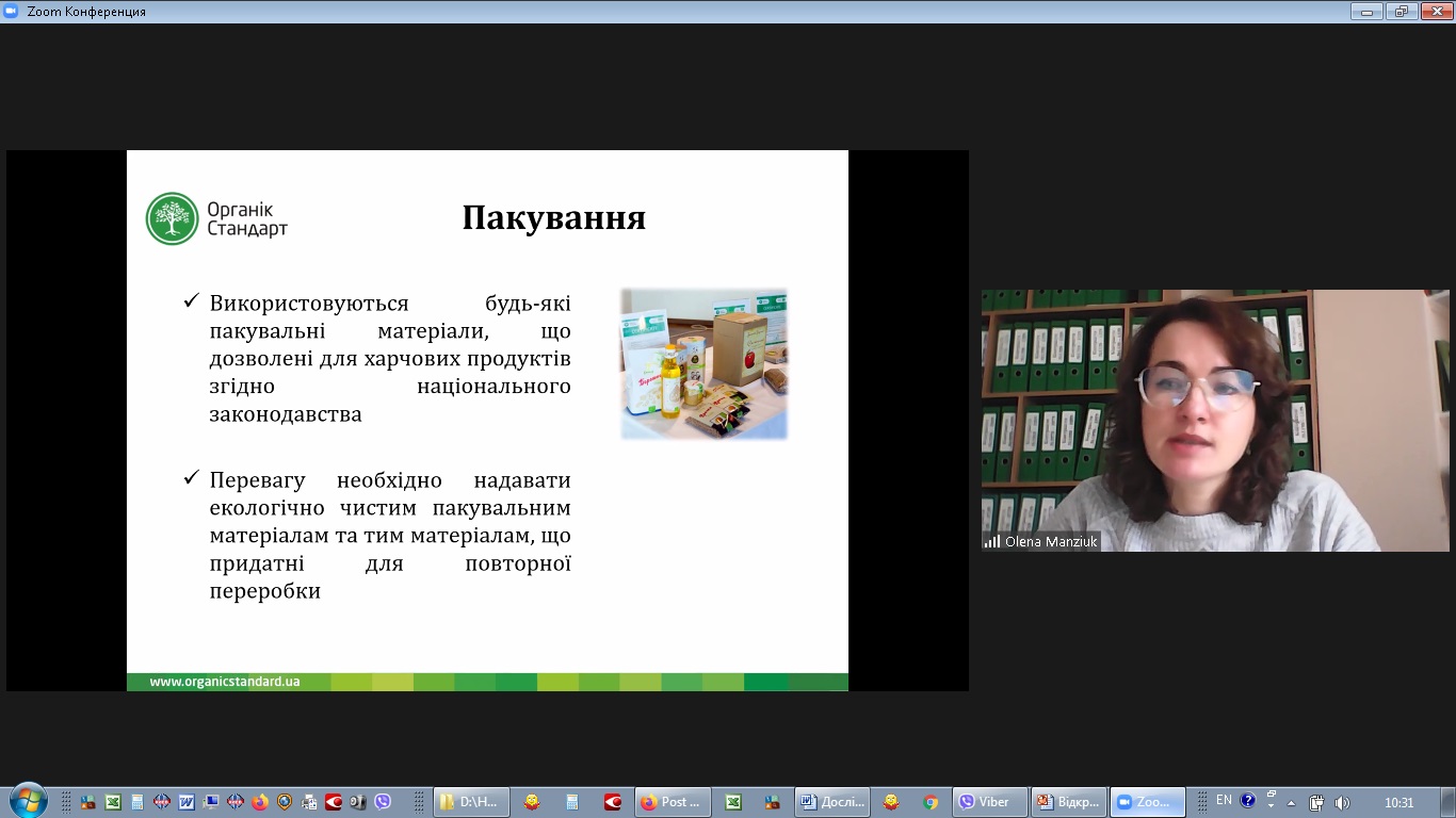 Спікерка акцентувала увагу на сертифікації органічного виробництва, підготовці необхідних документів для її проходження. Особлива увага була приділена принципам органічного виробництва харчових продуктів, їх рецептурному складу, використанню харчових добавок, дозволених Переліком речовин, які дозволяється використовувати у процесі органічного виробництва та які дозволені до використання у гранично допустимих кількостях; їх зберіганню та простежуваності на всіх етапах виробництва та реалізації. Лекторка також розповіла про особливості пакування, маркування та транспортування органічної продукції.