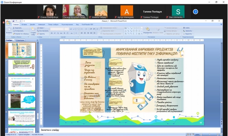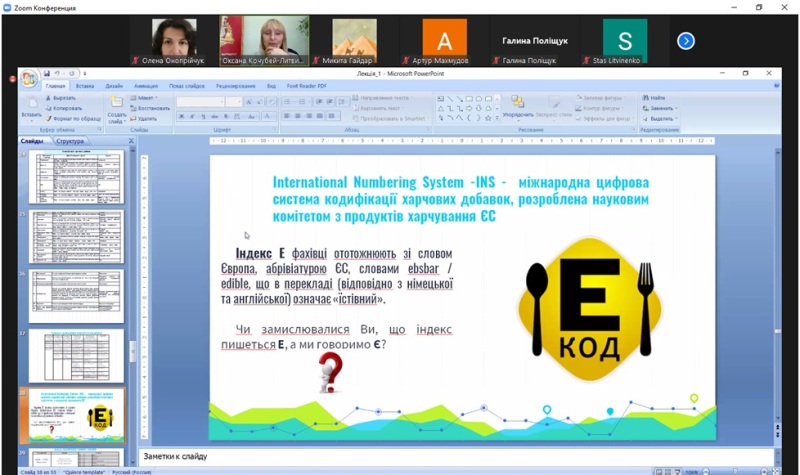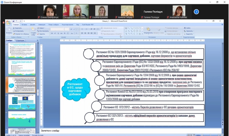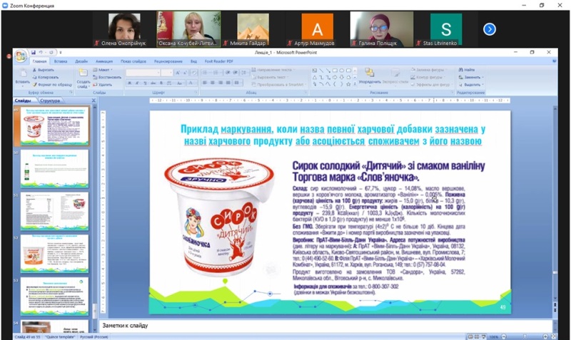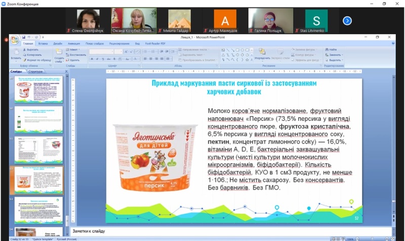Лекція на тему «Загальні відомості про харчові добавки та директиви Європейського союзу, що містять вимоги до них» була вступною до вибіркової освітньої компоненти «Харчові добавки: гармонізація регламентів ЄС у виробництві молочних і молоковмісних продуктів», яку здобувачі-магістранти 1 курсу обрали нещодавно з переліку вибіркових дисциплін освітньої програми. Тому лекторка подякувала усім здобувачам за їх вибір і запросила їх поринути у різноманітний світ харчових добавок для молочних і молоковмісних продуктів.