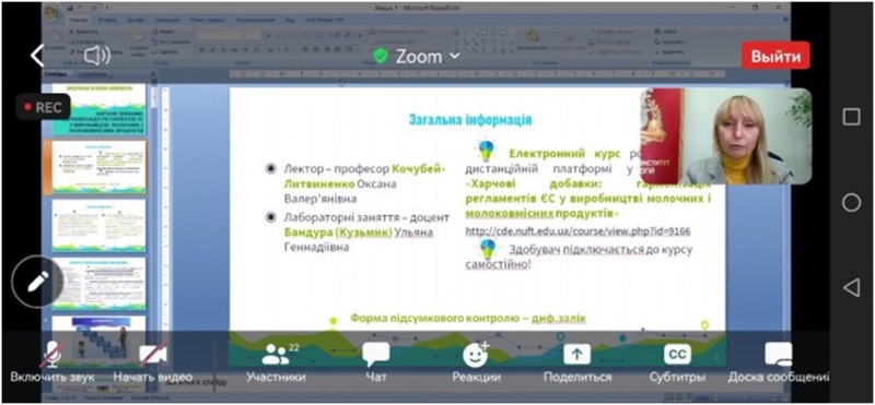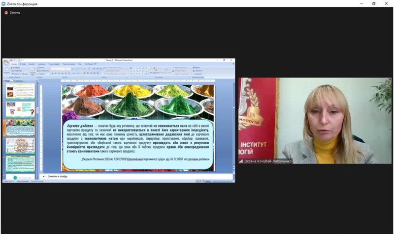 Під час викладання основного матеріалу лекції професорка Оксана Кочубей-Литвиненко детально зупинилася на загальних відомостях, основній термінології, меті використання харчових добавок при виробництві молочних і молоковмісних продуктів та основних способах їх введення до складу продукту; надала інформацію щодо установ і організацій, які на міжнародному та вітчизняному рівнях опікуються питаннями їх безпечного використання, перелічила регламенти Європейського парламенту та Ради ЄС, що містять вимоги до харчових добавок, та зосередила увагу на основних нормативних документах вітчизняного законодавства у сфері використання харчових добавок. При цьому лекторка анонсувала, що детальному вивченню регламентів ЄС будуть приділені наступні лекції, а здобути практичні навички їхнього застосування здобувачі зможуть під час виконання лабораторних робіт. У матеріалі лекції значний обсяг було виділено інформації щодо існуючих класифікацій харчових добавок та основних правил щодо розміщення інформації про харчові добавки на спожитковому пакуванні молочних і молоковмісних продуктів.