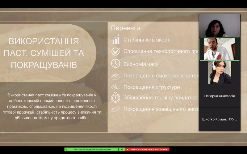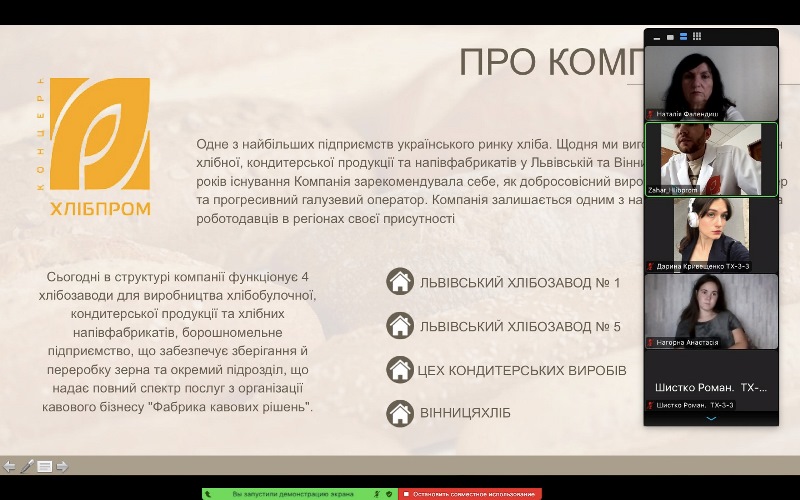 Під час лекції на тему «Якість хлібобулочних виробів в умовах воєнного часу із застосуванням інновацій» Захар Борковський розповів про структуру компанії, асортимент продукції, систему контролю якості на підприємстві. Особливу зацікавленість у здобувачів викликали інноваційні технології, які впроваджуються на підприємствах Концерну, наприклад пастеризація хліба, яка сприяє подовженню терміну його зберігання. Захар Борковський розповів про «CLEAN LABEL», маркування орієнтоване на споживача, яке заохочує виробників до розроблення продуктів із зрозумілими етикетками, у яких домінують натуральні інгредієнти та мінімальна кількість штучних добавок.