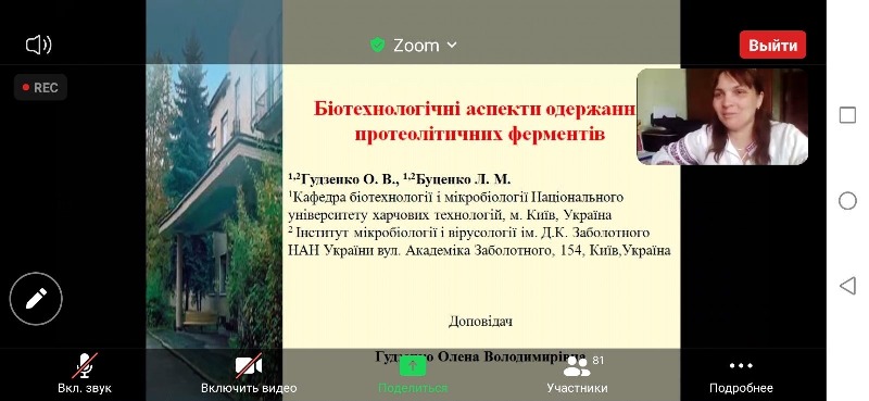 Звісно й наші викладачі активно долучилися до роботи наукового зібрання, зокрема своїм виступом присутніх потішила старша викладачка кафедри біотехнології і мікробіології Олена Гудзенко з доповіддю «Протеолітична активність культуральної рідини ґрунтових бактерій». Вона детально розповіла про одержання ферментів мікробного походження з виділених із ґрунту нових штамів Bacillussp. А1, А2, А3. За результатами проведених досліджень, встановлено, що дві культури Bacillussp. А2 і А3 проявляли високу протеолітичну активність при глибинному культивуванні. Зауважимо, що тематика цієї роботи є актуальною, адже обумовлюється практичною відсутністю вітчизняних біотехнологій ферментних препаратів при широких сферах їх застосування, наявністю мікробних продуцентів протеаз і перспективою розроблення біотехнології отримання протеолітичних ферментів.