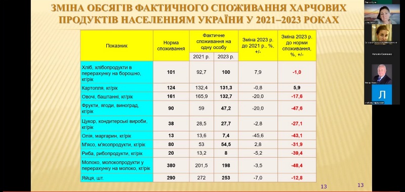 Учасники івенту з великою зацікавленістю вислухали представлені доповіді. Зокрема, дуже актуальною була доповідь «Умови і тенденції функціонування харчової промисловості України у період дії правового режиму воєнного стану» доктора економічних наук, професора кафедри економіки праці та менеджменту Віктора Ємцева, який детально висвітлив проблеми функціонування вітчизняного АПК і харчової промисловості в умовах війни.