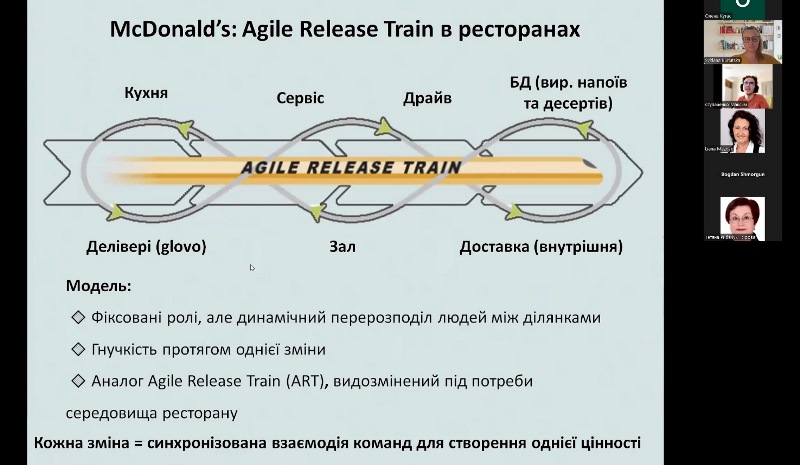 Менеджер інформаційних технологій ТОВ «Неогеймс Україна» Богдан Шморгун зацікавив присутніх своєю доповіддю про використання методології Agile на підприємствах харчової промисловості, а начальник дільниці ПІІ «МакДональдз Юкрейн ЛТД» Максим Ступаченко продовжив розгляд цього питання, представивши доповідь «Впровадження Scaled Agile Framework (SAFe) як засіб подолання управлінських викликів».