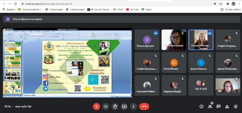 Кафедра готельно-ресторанної справи сфокусована на профорієнтаційній роботі зі здобувачами фахових коледжів. Цього разу на відеозв’язку – Львів. 23 листопада до освітнього онлайн-простору Відокремленого структурного підрозділу «Львівський фаховий коледж харчової та переробної промисловості Національного університету харчових технологій» завітали заступниця декана факультету готельно-ресторанного та туристичного бізнесу по роботі зі студентами Олена Тищенко та відповідальна від випускової кафедри за профорієнтаційну роботу Ольга Дулька. Слухачі профорієнтаційного івенту – здобувачі освіти спеціальності 241 «Готельно-ресторанна справа».