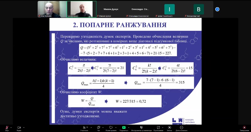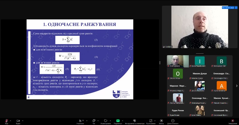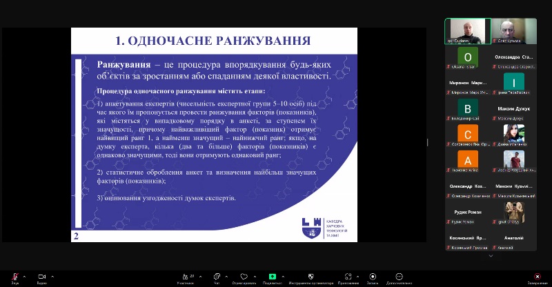 Лекція охопила сучасні підходи до експертного оцінювання у харчових технологіях, зокрема методи одночасного та попарного ранжування, як інструменти прийняття обґрунтованих технологічних рішень. Значну увагу було приділено методиці формування експертного середовища, анкетуванню, обробленню результатів і практичному застосуванню отриманих даних.