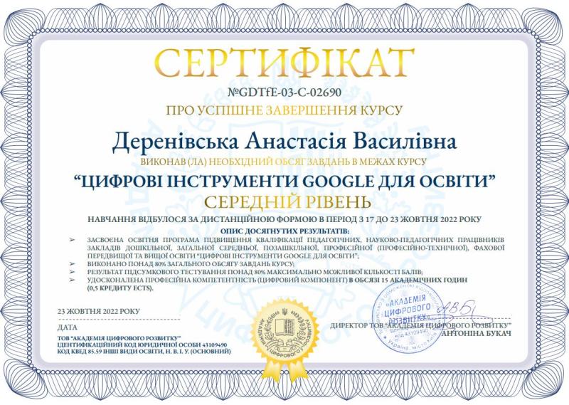 Викладачка кафедри мехатроніки та пакувальної техніки к.т.н., доцентка Анастасія Деренівська успішно завершила позапланове підвищення кваліфікації – повний курс «Цифрові інструменти Google для освіти» за базовим, середнім і поглибленим рівнями від ТОВ «Академія цифрового розвитку», яке тривало з 3 по 30 жовтня 2022 року.