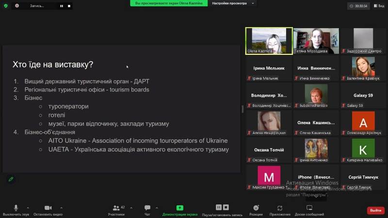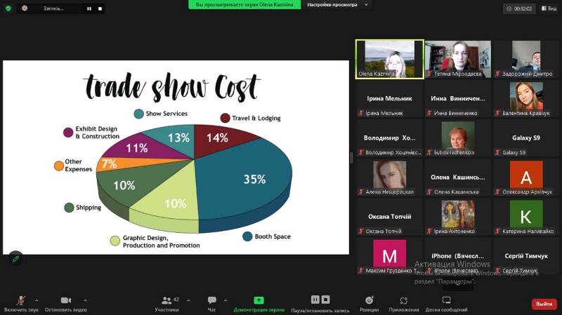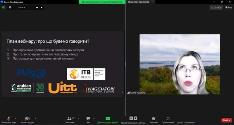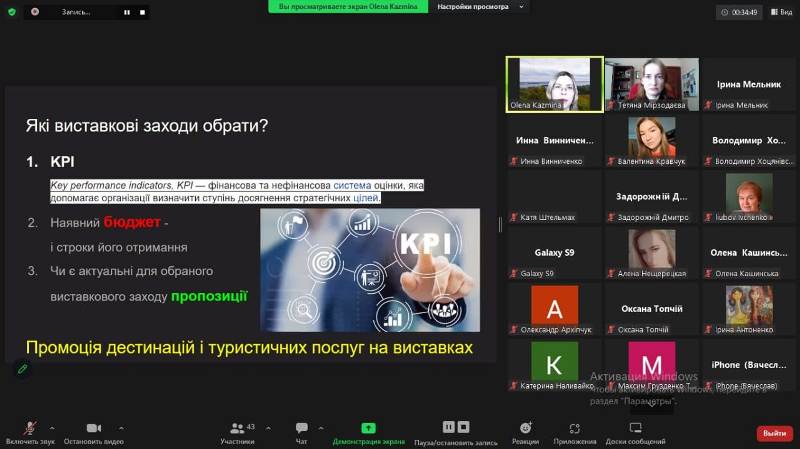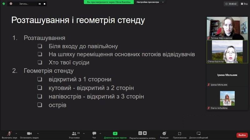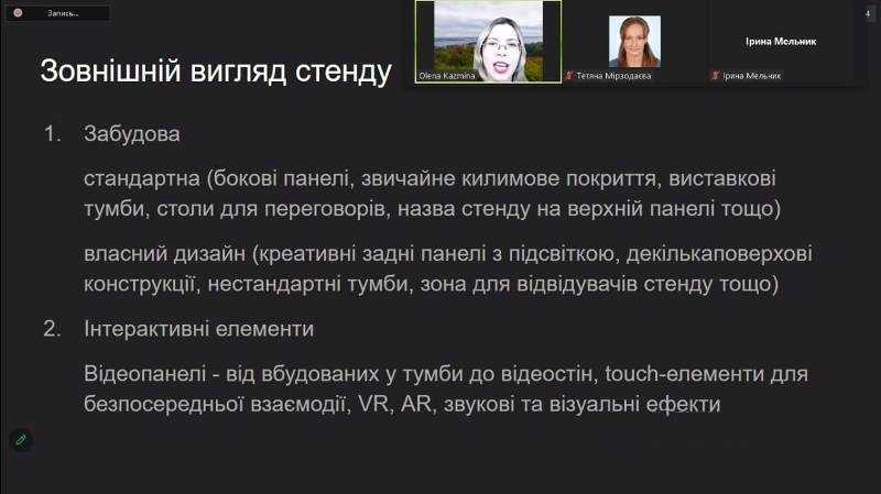 Спікерка побудувала лекцію з урахуванням програми навчання та попереднього досвіду участі у виставкових заходах здобувачів. Головні акценти були розставлені на питаннях: яку виставку обрати; активний туризм і outdoor; хто їде на виставку; які виставкові заходи обрати; як працювати на виставковому стенді ефективно і помітно; розташування і геометрія стенду; зовнішній вигляд стенду; які заходи підвищують ефективність роботи на виставці.