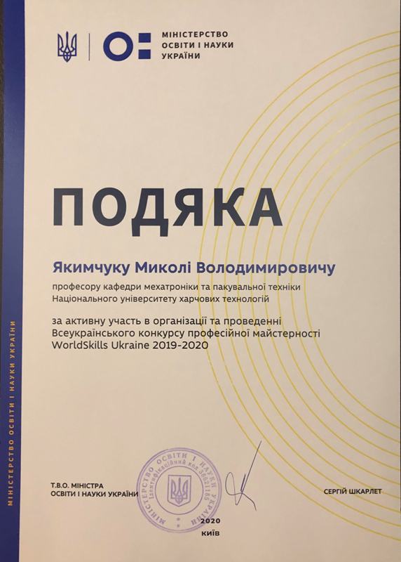 Оргкомітетом конкурсу був високо оцінений професійний внесок в організацію та проведення змагань у компетенції «Мехатроніка» здобувачів освіти нашого університету, членів гуртка «Мехатроніка» Анни Харкевич, Марії Аліпатової, Дмитра Данюка та професора кафедри мехатроніки і пакувальної техніки Миколи Якимчука, який отримав подяку від т.в.о. міністра освіти і науки Сергія Шкарлета за активну участь в організації та проведенні конкурсу.