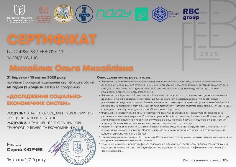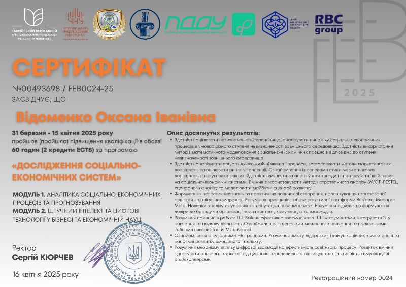 Доценти кафедри економіки і права успішно пройшли підвищення кваліфікації в межах програми «FEB-2025» від Таврійського державного агротехнологічного університету імені Дмитра Моторного на тему «Дослідження соціально-економічних систем».