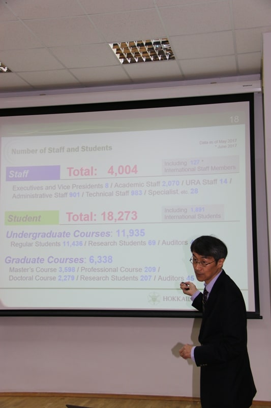 Розпочав зустріч професор Сатору, розповівши історію свого університету, котра настільки подібна до нашої. Як у 1876 році постав Сільськогосподарський коледж у найбільшому місті острова Хоккайдо – Саппоро, який у 1918 році отримав назву Імператорського університету, а потім, у 1947-му, зажив свого теперішнього статусу. Студенти та викладачі шанують традиції власної альма-матер – спільно будують снігові скульптури під час Фестивалю снігу, змагаються у перетягуванні канату, а також – і це найголовніше! – усі разом милуються природою, без чого неможливе життя справжніх японців. Незалежно від професії, віку та становища.