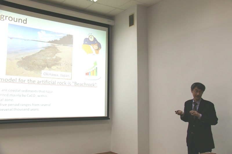 Надалі професор Сатору виголосив доповідь, яка, без сумніву, викликала інтерес не лише з точки зору екології та біотехнологій, а й географії та геології. Головною темою виступу були екологічні проблеми берегової лінії та способи їх вирішення. Адже з давніх-давен бичем Японії є цунамі та землетруси, що неминуче спотворюють екологічну систему узбережжя. А як вирішити цю проблему? – подумайте, – звертається до слухачів Сатору-сан. Хвилерізи будувати – дорого. І, виявляється, вихід можна знайти! Треба «звернутися по допомогу» до найпростіших – мікроорганізмів, які сприяють створенню так званого «берегового каменю» (англійською – beach rocks).