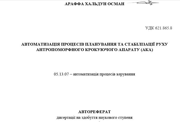 Тематикою доповіді, що представляв громадянин Сирії Арафф Хальдун Осман на здобуття ступеня кандидата технічних наук, пропонувалося здійснювати керування людиноподібним крокуванням робототехнічного засобу.