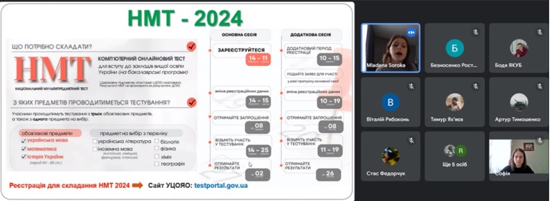 Представники НУХТ ознайомили учнів із перевагами навчання в НУХТ, розповіли про структурні підрозділи – інститути та факультети університету, надали інформацію про особливості вступної кампанії 2024 року, обов’язковою умовою якої є складання НМТ.