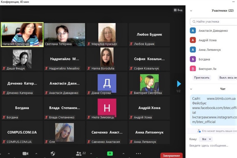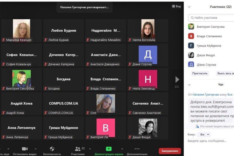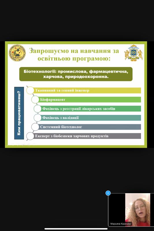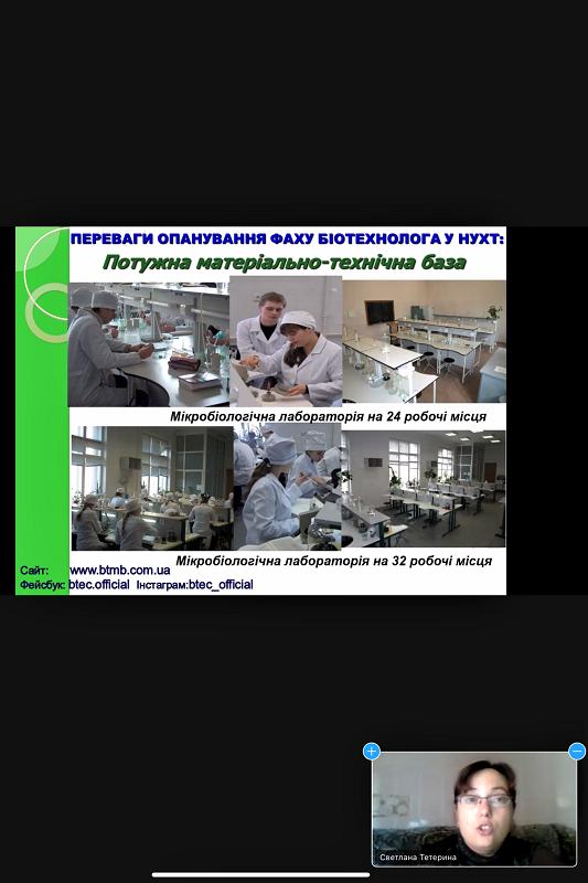 Метою зустрічі було ознайомлення майбутніх випускників коледжу з перспективами отримання кваліфікації біотехнолога у НУХТ, а також навчання за іншими спеціальностями, що представлені в нашому університеті. Саме тому доцентка кафедри Світлана Тетеріна на початку зустрічі навела аргументи на користь продовження навчання після випуску з коледжу та акцентувала увагу на перевагах одержання вищої біотехнологічної освіти саме у нашому університеті, а студентка-біотехнолог 4-го курсу Мар’яна Красько поділилася власним досвідом вступу після закінчення коледжу на скорочену форму навчання та особливостями студентського життя. А ще вона розповіла про організацію навчання на факультеті біотехнології та екологічного контролю (БТЕК), зокрема проведення лабораторних робіт, на яких їй пощастило побувати також і в лабораторіях кафедри, не зважаючи на епідемічний стан у країні, а ще Мар‘яна зазначила що і в дистанційні періоди навчання викладачі організовують прямі трансляції з лабораторій, і це значно покращує сприйняття матеріалу та опанування необхідних фахових навиків. Своїми враженнями від навчання поділилася також студентка третього курсу Ганна Бородуля, яка зазначила, що навіть, не дивлячись на обмеження живого спілкування, студенти факультету дуже дружні і соціально активні.