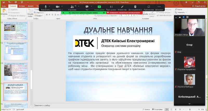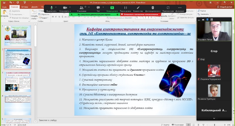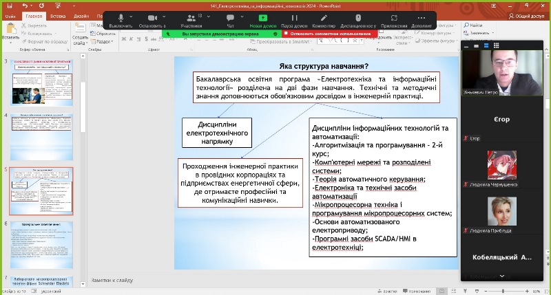 Петро Зінькевич наголосив на перевагах навчання за бакалаврським рівнем вищої освіти за освітньо-професійною програмою «Електротехніка та інформаційні технології». Слухачі дізналися, що програма передбачає поглиблену теоретичну і практичну підготовку з використанням інформаційних технологій для проведення проєктно-технологічних і виробничо-технологічних робіт у галузі електроенергетики, електротехніки та електромеханіки, застосування сучасних технічних і програмних засобів автоматизації, спеціалізованого програмного забезпечення. Також спікер розповів про можливості навчання за дуальною формою та перспективи працевлаштування випускників освітньої програми.