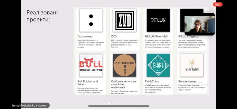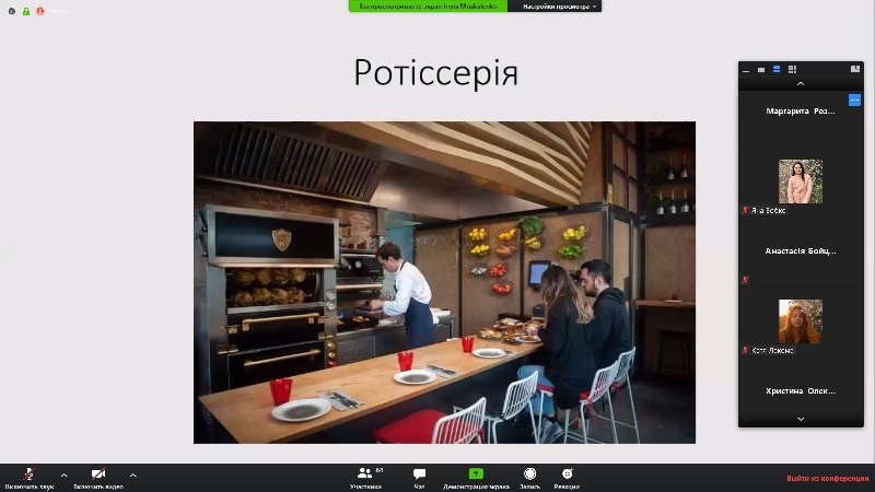 Онлайн-лекцію «Проєктне моделювання діяльності закладів сфери HoReCa» для студентів 4 курсу спеціальності «Готельно-ресторанна справа» у межах вивчення навчальної дисципліни «Проєктування об’єктів готельно-ресторанного господарства» прочитала технолог-проєктант компанії «Total Kitchen» і випускниця факультету готельно-ресторанного та туристичного бізнесу Ірина Москаленко.