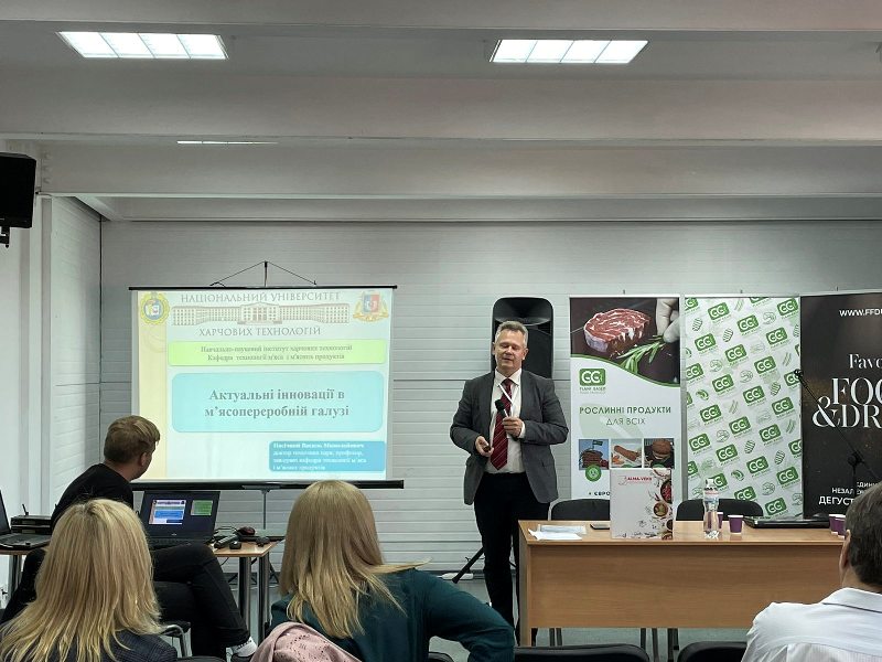 Завідувач кафедри технології м'яса і м'ясних продуктів нашого університету Василь Пасічний у своїй доповіді представив інформацію про інноваційні підходи кафедри щодо організації навчального процесу, направлені на підвищення фахових компетентностей здобувачів вищої освіти, окреслив підходи щодо їх практичної підготовки із залученням створеної на кафедрі спільно з агрохолдингом МХП R&D-лабораторії, а також лабораторного устаткування Проблемної науково-дослідної лабораторії та Центру колективного користування науковим обладнанням «Лабораторія біобезпеки, якості харчової продукції та безпеки харчування», спільно з якими кафедра займається науковими дослідженнями та запропонував підприємствам використовувати можливості лабораторного фонду НУХТ.