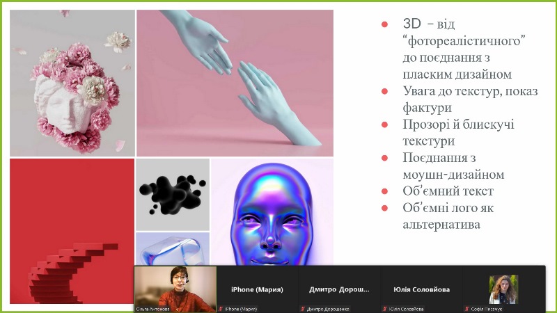 Майбутні рекламісти дізналися, як аналізувати провідні тренди у рекламі, брендингу, айдентиці, де шукати інформацію про найтрендовіші кольори року й найкрутіші шрифти та логотипи. Говорили про те, чому для рекламіста важливо свідомо ставитися до застосування модних тенденцій у своїх творчих проєктах й уникати сліпого копіювання трендів, про те, які тренди стали довговічними, а які ризикують швидко застаріти.