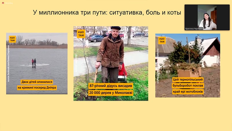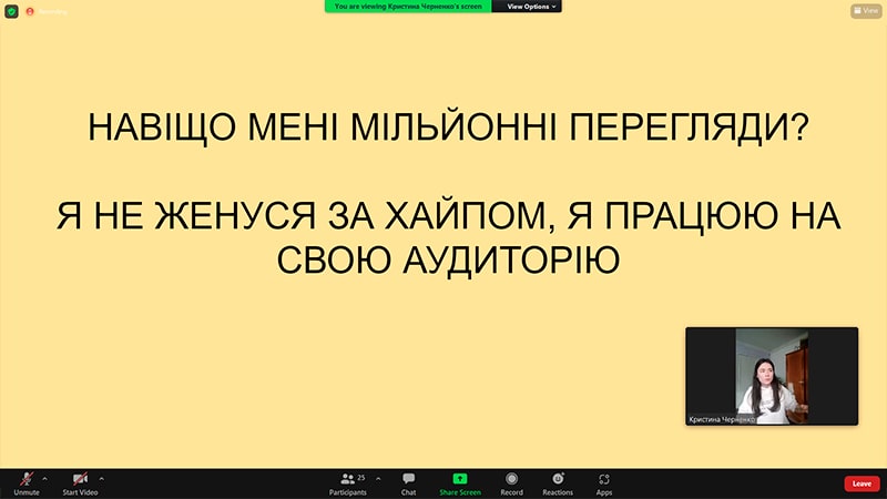 Майбутні рекламісти дізналися, як зробити відео на мільйон переглядів, виокремили трьох китів популярності та з’ясували, чому справжній професіонал має знати все про біль і проблеми своїх глядачів. Говорили про те, чому для рекламіста важливо бути емпатичним, як знайти ті теми, що найбільше хвилюють цільову аудиторію, та де шукати натхнення. Спікерка поділилася досвідом, як відео з позитивними новинами ‒ історіями про здобутки й успішний досвід українців у різних сферах ‒ допомагали розвиткові малого бізнесу, територіальних громад і давали привід для гордості за свою Батьківщину мільйонам людей, ставали медіа популярними, забезпечивши значну кількість переглядів й широке охоплення аудиторії.