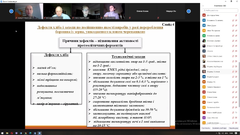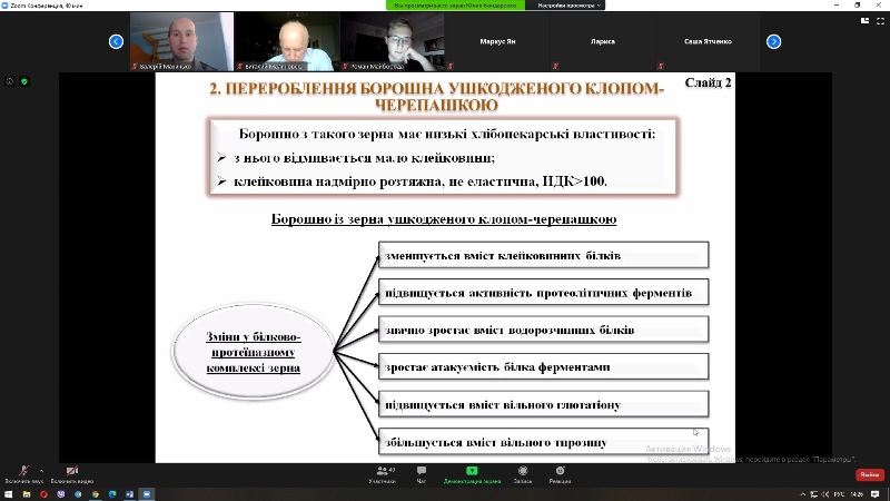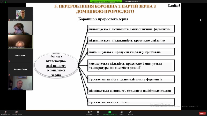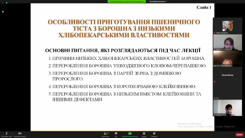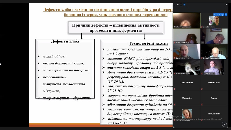 Заняття відбулося в режимі конференції ZOOM, до нього приєдналися завідувач та викладачі кафедри технології хлібопекарських і кондитерських виробів. Викладання лекційного матеріалу супроводжувалося мультимедійною презентацією, що містила схеми, таблиці та рисунки.