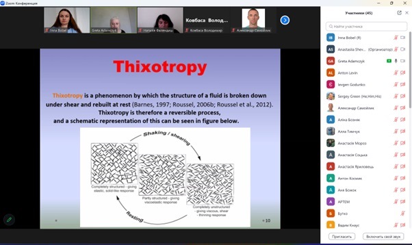 Лекція була присвячена передовим науковим дослідженням у явищі тиксотропії в системах крохмалю різного ботанічного походження. Також лекторка представила результати власних досліджень у зазначеному напрямку та навела приклади можливого їх практичного застосування у харчових технологіях.
