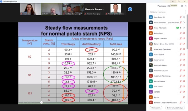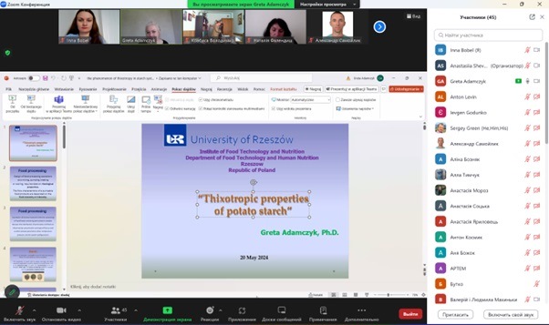 На кафедрі технології хлібопекарських і кондитерських виробів відбулася гостьова лекція на тему «The phenomenon of thixotropy in starch systems» викладачки та науковиці Інституту харчових технологій та харчування Жешувського університету (Польща), др. Грети Адамчик для здобувачів освітнього ступеня «Магістр», освітніх програм «Технології хліба, кондитерських, макаронних виробів та харчоконцентратів» і «Технології органічних харчових продуктів».